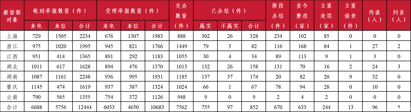 截至5月20日晚20:00,各督察组共收到群众来电、来信举报12444件,受理有效举报10683件,经梳理合并重复举报,累计向被督察地方转办7562件;被督察地方已办结或阶段办结1522件,其中立案处罚244家;立案侦查13件;约谈党政领导干部96人,问责党政领导干部5人。