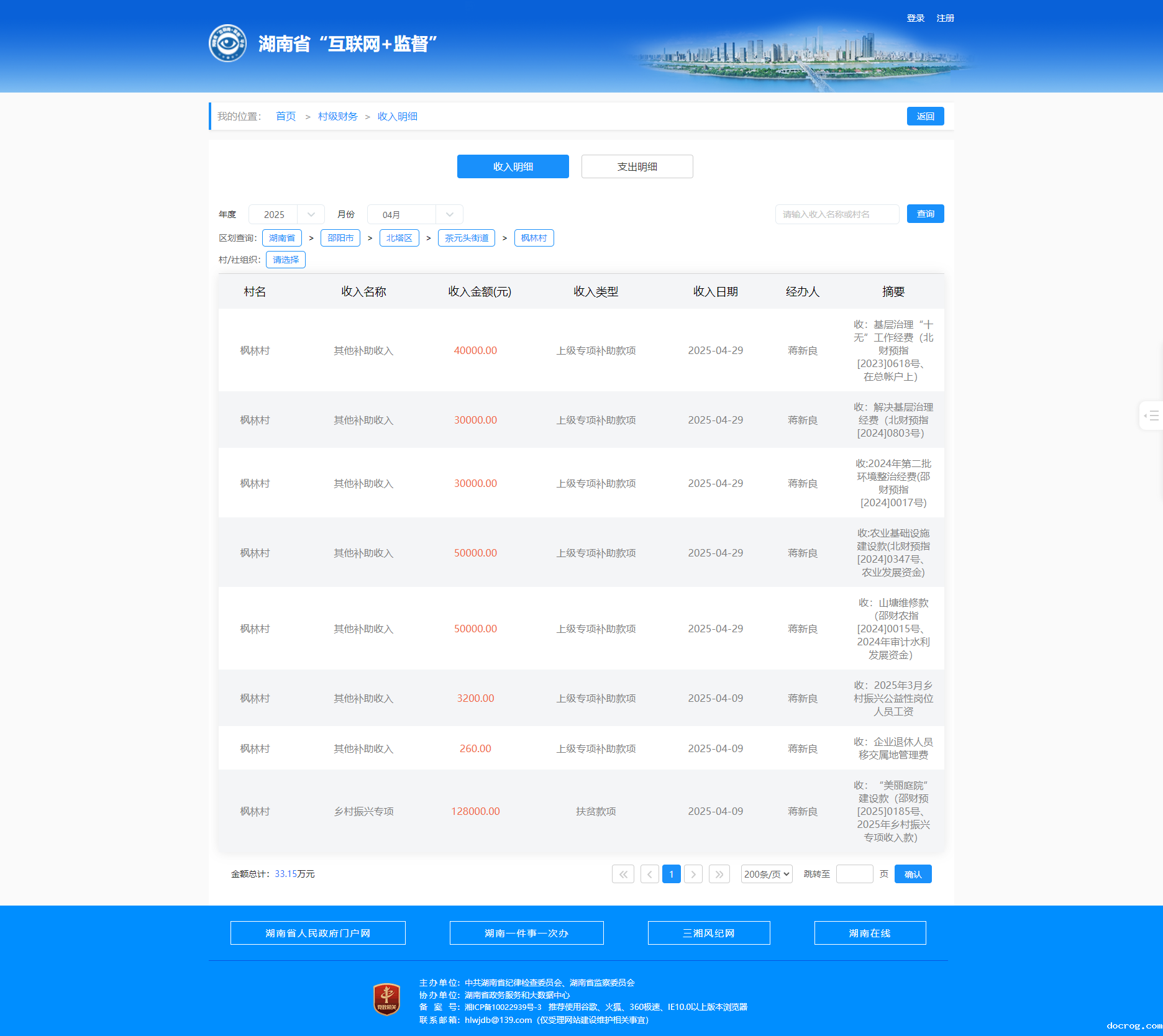 2025年4月枫林村村级财务收入明细