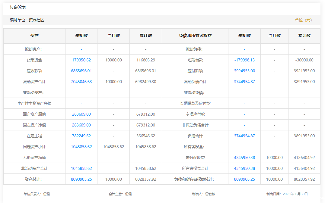 2025年5月资园社区村级财务资产负债明细
